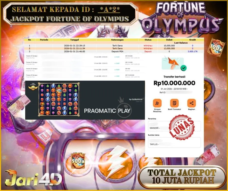 BUKTI WITHDRAW JARI4D KEMENANGAN JACKPOT FORTUNE OF OLYMPUS Rp.10.000.000,- LUNAS