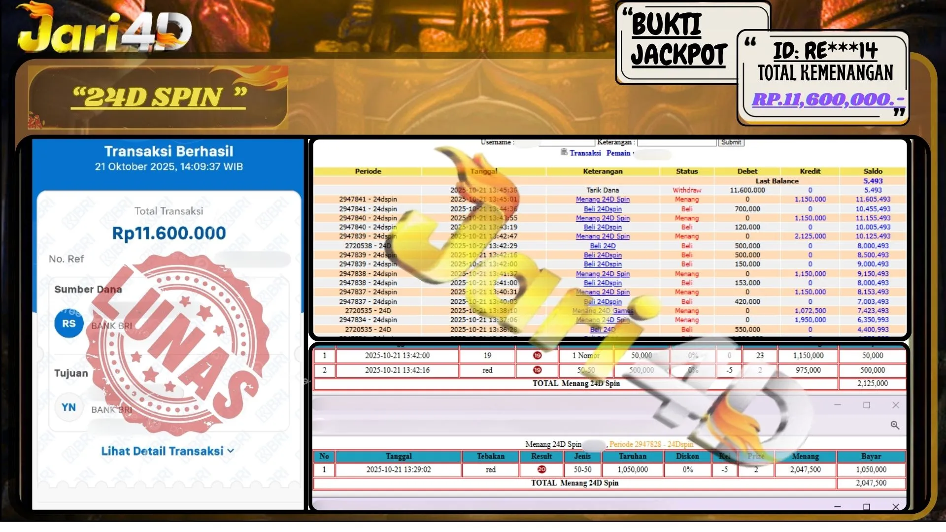 Bukti JP 24D SPIN Hari ini Di Situs JARI4D Sebesar Rp.11,600,000,- Tuntas !!
