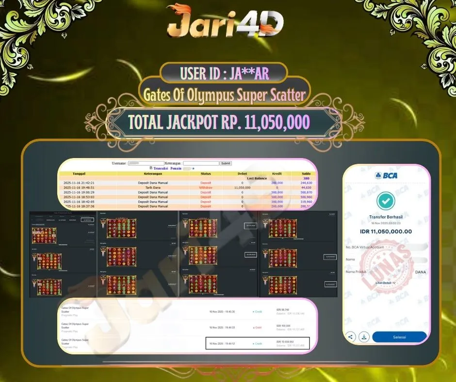 Bukti JP Gates Of Olympus Super Scatter Hari ini Di Situs JARI4D Sebesar Rp.11,050,000,- Tuntas !!