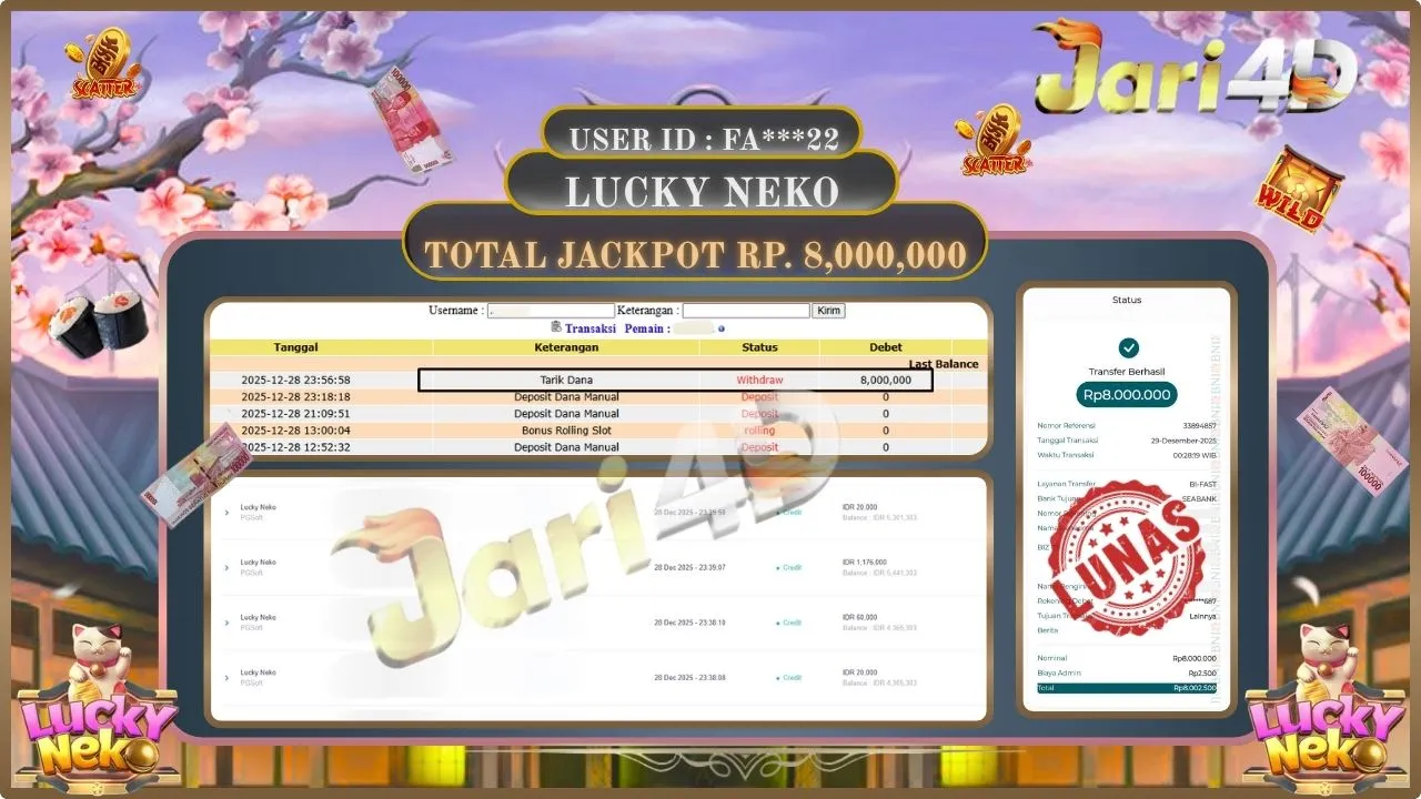 Bukti JP LUCKY NEKO Hari ini Di Situs JARI4D Sebesar Rp8,00,000,- Tuntas !!