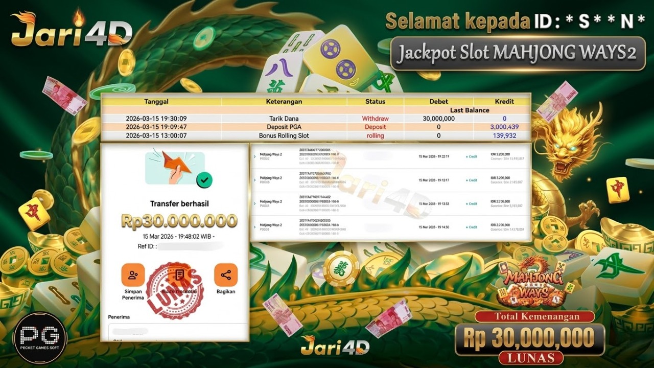 Bukti JP MAHJONG WAYS 2 Hari ini Di Situs JARI4D Sebesar Rp. 30,000,000,- Tuntas !!