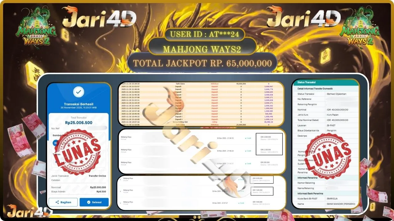 Bukti JP MAHJONG WINS2 Hari ini Di Situs JARI4D Sebesar Rp.65,000,000,- Tuntas !!