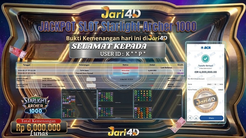 Bukti JP SLOT STARLIGHT ARCHER 1000 Hari ini Di Situs JARI4D Sebesar Rp. 6,000,000,- Tuntas !!