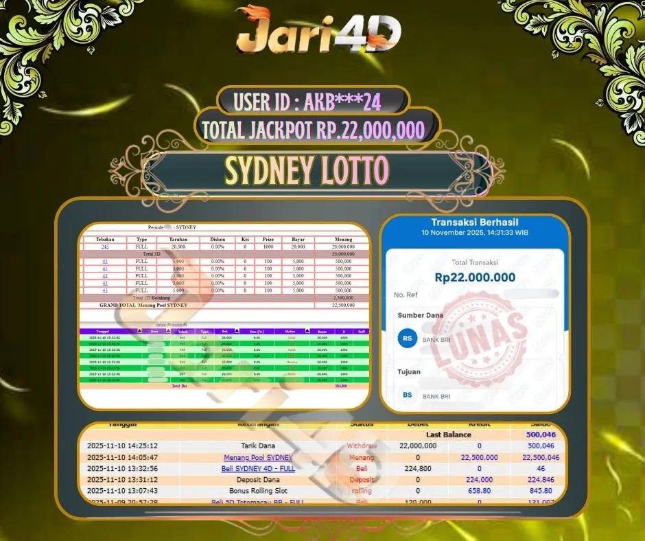 Bukti JP SYDNEY LOTTO Hari ini Di Situs JARI4D Sebesar Rp.22,000,000,- Tuntas !!