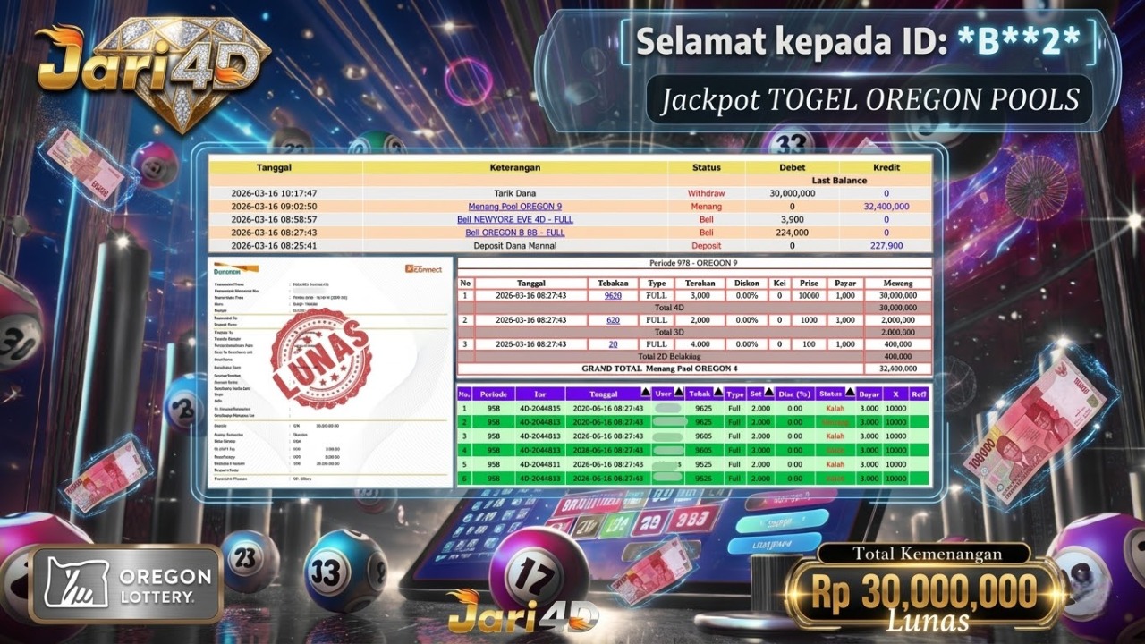 Bukti JP TOGEL OREGON Hari ini Di Situs JARI4D Sebesar Rp. 30,000,000,- Tuntas !!
