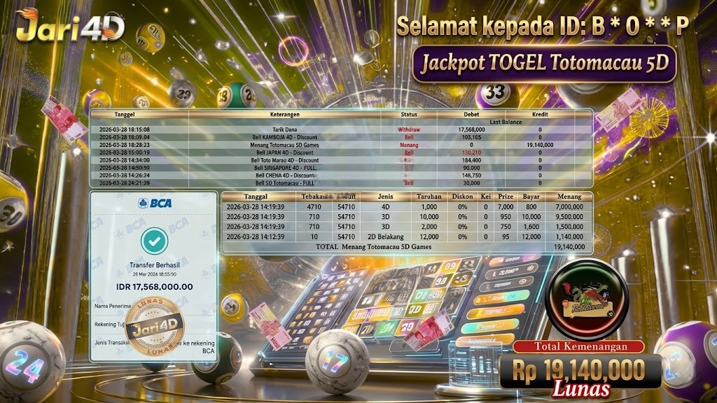Bukti JP TOGEL TOTOMACAU 5D Hari ini Di Situs JARI4D Sebesar Rp. 19,140,000,- Tuntas !!