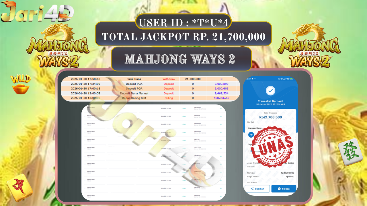 BUKTI WITHDRAW JARI4D KEMENANGAN JACKPOT MAHJONG WAYS 2 Rp.21.700.000,- LUNAS