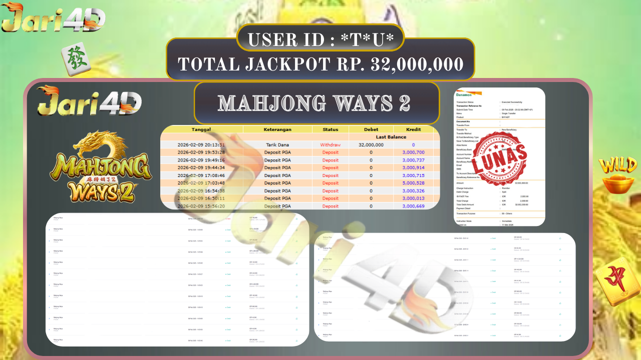 BUKTI WITHDRAW JARI4D KEMENANGAN JACKPOT MAHJONG WAYS 2 Rp.32.000.000,- LUNAS