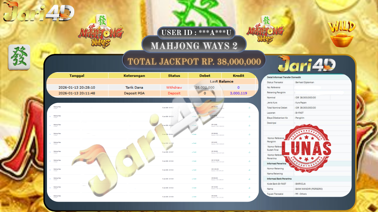 BUKTI WITHDRAW JARI4D KEMENANGAN JACKPOT MAHJONG WAYS 2 Rp.38.000.000,- LUNAS