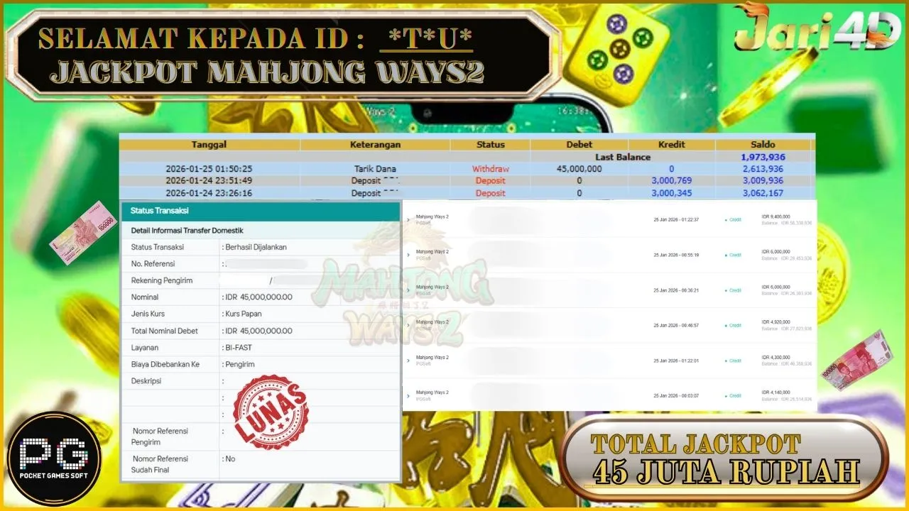BUKTI WITHDRAW JARI4D KEMENANGAN JACKPOT MAHJONG WAYS2 Rp.45.000.000,- LUNAS